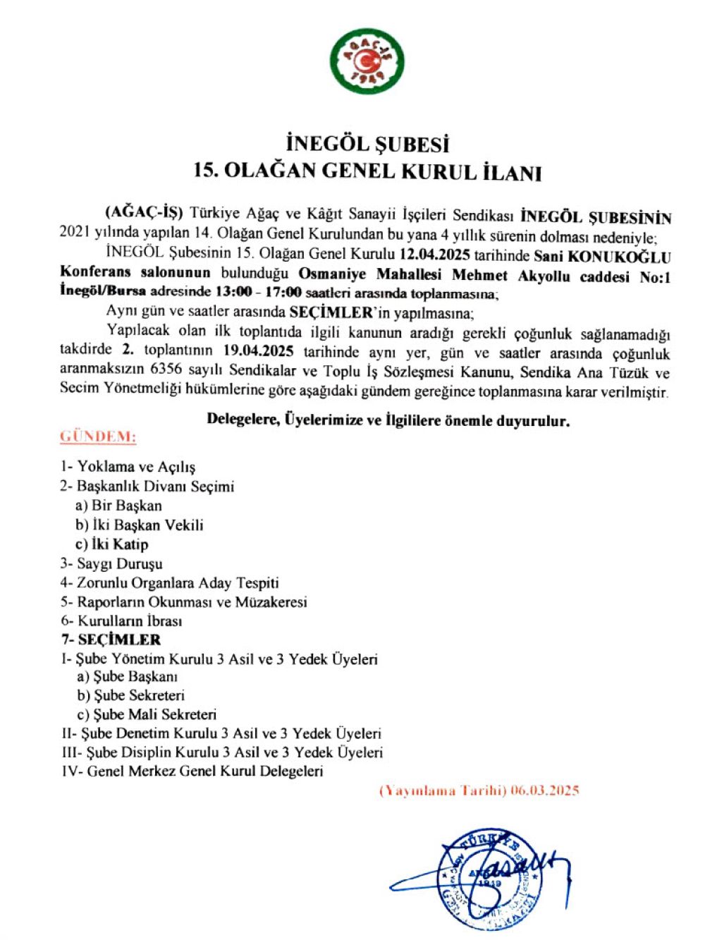 İNEGÖL ŞUBESİ 15. OLAĞAN GENEL KURUL İLANI
