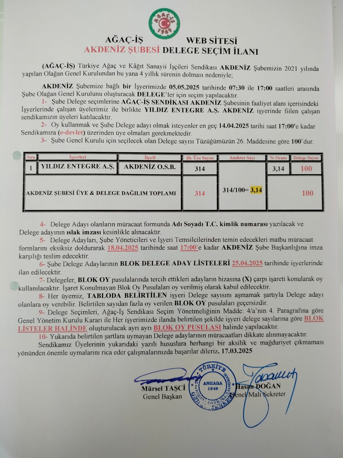 AĞAÇ-İŞ AKDENİZ ŞUBESİ DELEGE SEÇİM İLANI