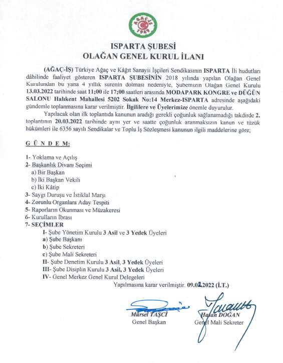 AĞAÇ-İŞ SENDİKASI ISPARTA ŞUBESİ OLAĞAN GENEL KURUL İLANI